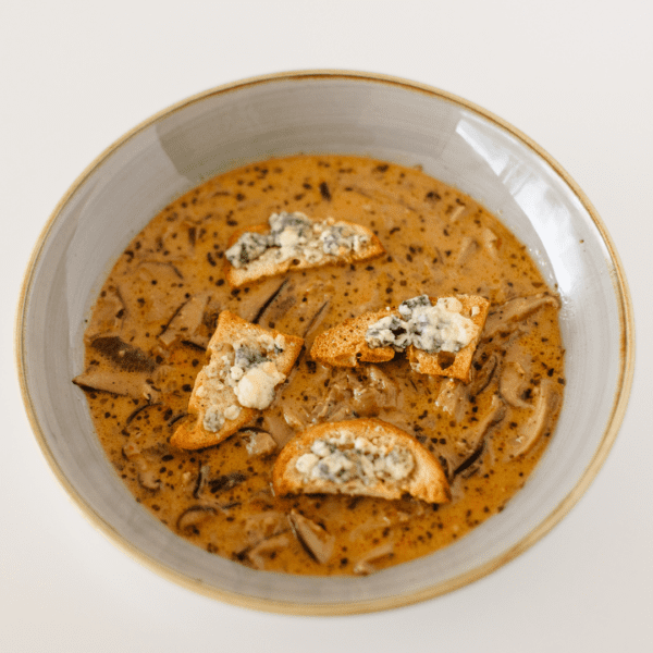 Rustic Mushroom Soup with Blue Cheese Croutons
